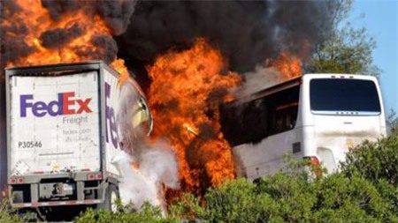 Xe khách và xe tải của hãng Fedex bốc cháy sau khi tông vào nhau. |