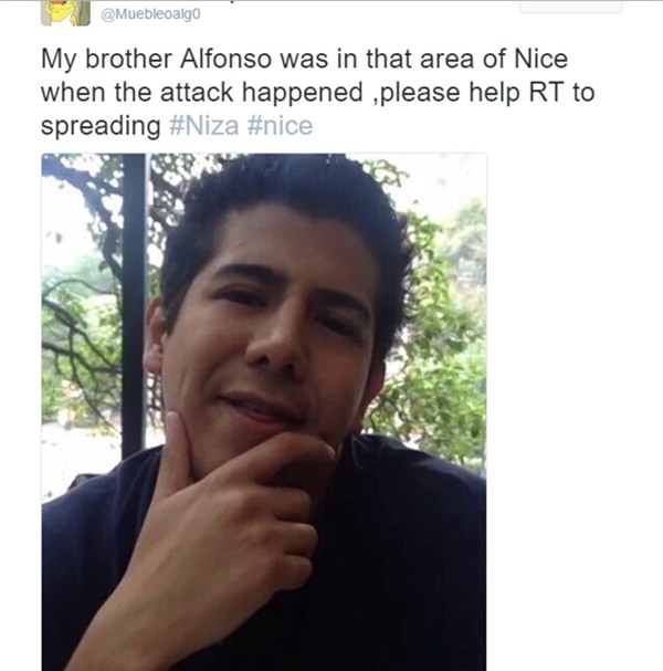 “Anh trai tôi là Alfonso. Anh ấy đã ở Nice khi vụ tấn công xảy ra.” – Một người chia sẻ hình ảnh Alfonso lên mạng sáng nay. Ngày cả thảm họa máy bay EgyptAir hay France24, Alfonso cũng là nạn nhân.