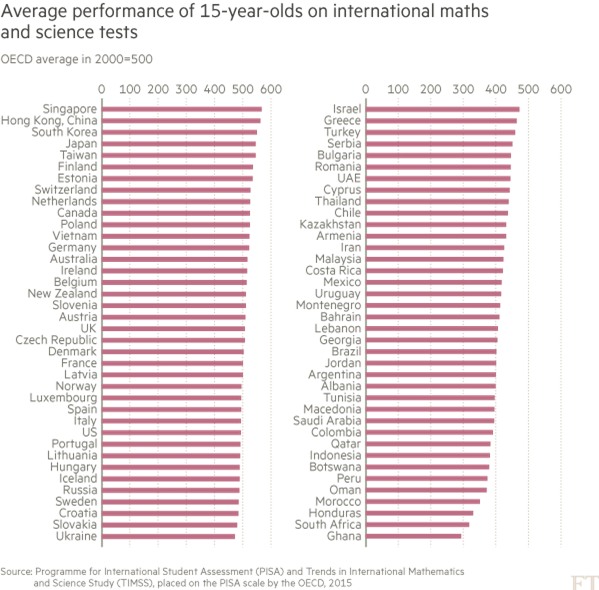 Theo số liệu của Tổ chức Hợp tác và Phát triển Kinh tế (OECD) về khả năng làm toán cũng như học các môn khoa học khác của những học sinh dưới 15 tuổi tại 76 nền kinh tế, Singapore đứng đầu bảng, tiếp theo đó là Hồng Kông, Hàn Quốc, Nhật Bản và Đài Loan.