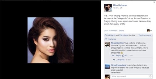 Với những điều kiện trên, Phạm Hương được sự ủng hộ, cổ vũ rất lớn từ phía khán giả nhà. Đặc biệt hơn, cô còn được đông đảo bạn bè thế giới khen ngợi khi hình ảnh của cô được đăng tải trên trang web chính thức của Hoa hậu Hoàn vũ 2015. Đa phần đều gửi tặng lời khen ngợi đối với nhan sắc của Phạm Hương. Rất nhiều fan ngoại cho rằng hoa hậu Phạm Hương sở hữu một vẻ đẹp hoàn hảo và có khả năng giành chiến thắng trong cuộc thi. Hiện tại, hình ảnh của cô đang được nhiều lượng like nhất trên trang web của chương trình với hơn 23 nghìn lượt. Bỏ xa các đối thủ đến từ 80 quốc gia khác.