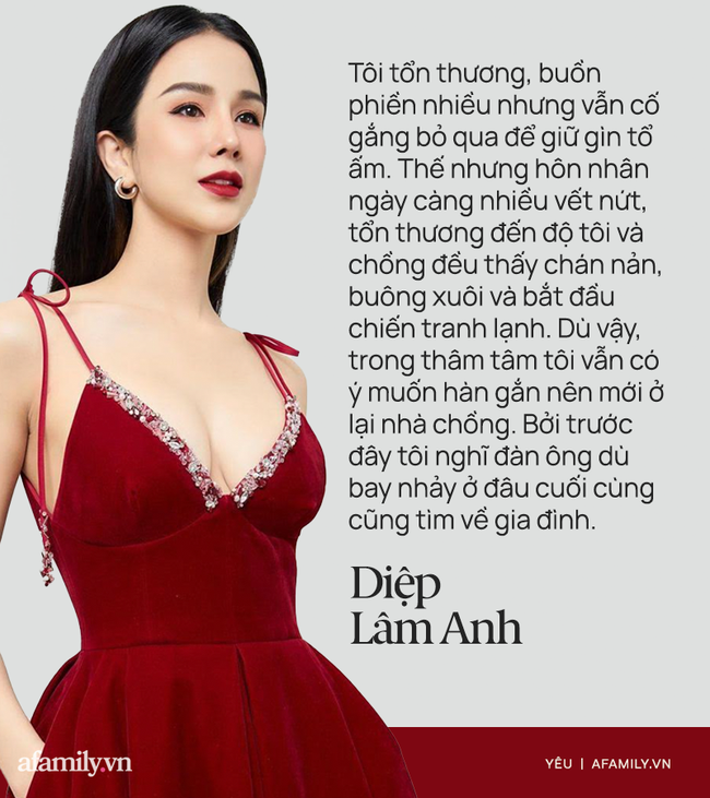 "Tôi hy vọng chúng tôi cho nhau khoảng thời gian thoải mái đầu óc, ít giao tiếp, trò chuyện với nhau cũng được, để cùng bình tâm suy nghĩ mọi việc. Tôi vẫn mong chúng tôi có thể quay lại với nhau vì các con, vì gia đình. Nghĩ vậy mà tôi cố gắng ở lại tới phút chót, đến lúc thấy hết hy vọng hoàn toàn tôi mới buông tay". Người phụ nữ xinh đẹp, giỏi giang như Diệp Lâm Anh vẫn phải dốc toàn lực để giữ chồng, giữ nền tảng gia đình, giữ bố cho con mình, giữ bao công sức cùng nhau vun vén xây đắp bấy lâu.