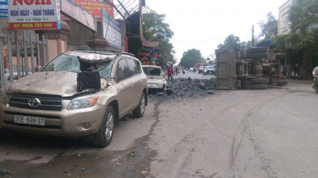 Tuy nhiên, do cú đánh lái mạnh, chiếc xe tải mất phương hướng va chạm với 2 xe ôtô: Toyota BKS 30E-688.97 và Kia Morning BKS 29D-095.37 đang đỗ bên đường, rồi bị lật nghiêng giữa đường.
