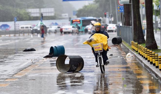 | Một tài xế liều mình làm việc khi cơn bão Hato đổ bộ vào miền Nam Trung Quốc tháng 8/2017. Ảnh: Xinhua. |