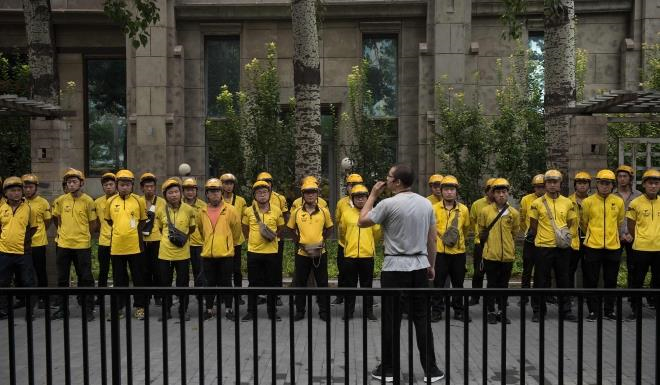 | Nhân viên Meituan họp giao ban vào buổi sáng trên một con phố ở Bắc Kinh. Ảnh: AFP. |