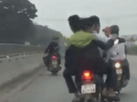 Một số xe máy phía sau còn kẹp ba rồi tạt đầu ô tô, khi tới gần xe máy cố tình phanh rồi đi thật chậm không cho ô tô vượt lên mặc cho ô tô nhấn còi liên tục.