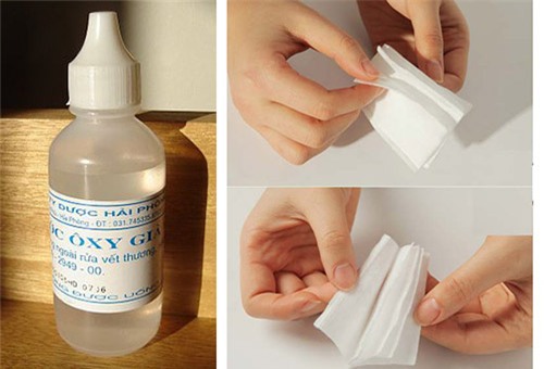 - Đổ oxy già ra bát, nhúng ướt bông tẩy trang vào đó và bắt đầu thực hiện theo những bước sau: