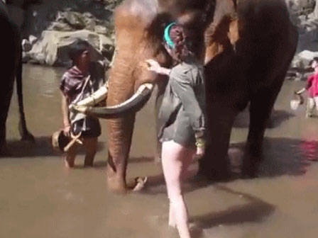Đang mải mê tắm rửa cho một chú voi rừng, nữ du khách bỗng la hét thất thanh khi bị con vật này hất văng xa cả mét chục mét trước sự bất ngờ của nhân viên quản tượng.