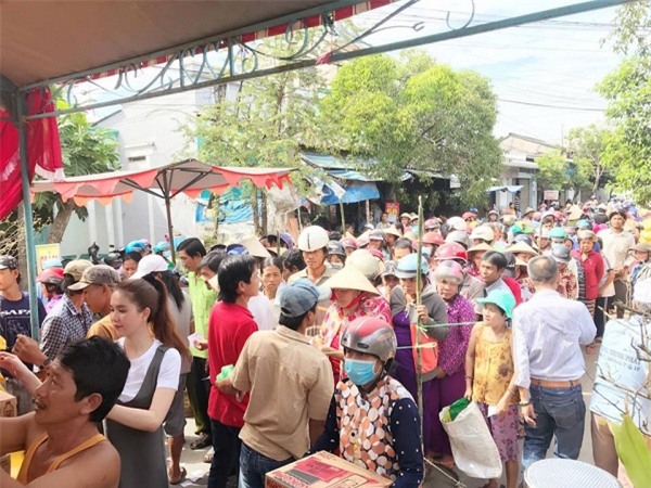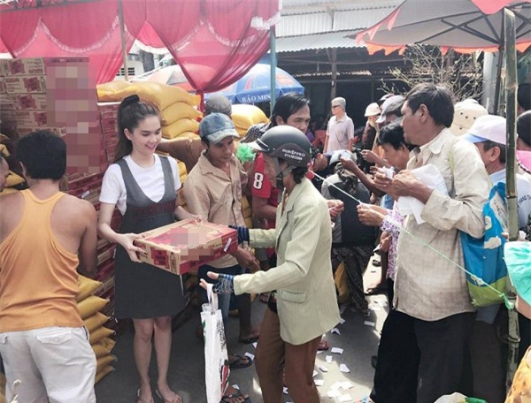 Nữ hoàng nội y” đi dép xỏ ngón, mặc trang phục giản dị đứng phát quà cho bà con.