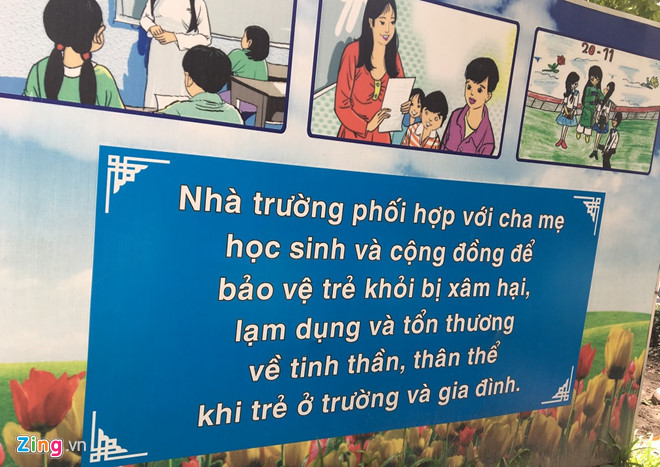Phóng viên tìm đến trường Tiểu học T.X, nơi thầy Hùng giảng dạy và cũng là nơi các em đang theo học. Một góc giữa khuôn viên trường gây chú ý với tấm bảng có dòng chữ: “Nhà trường phối hợp với cha mẹ học sinh và cộng đồng để bảo vệ trẻ khỏi bị xâm hại, lạm dụng và tổn thương về tinh thần, thân thể khi trẻ ở trường và gia đình”.