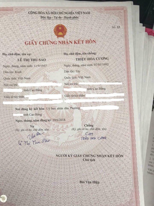 Gấy chứng nhận kết hôn của vợ chồng anh Cương.