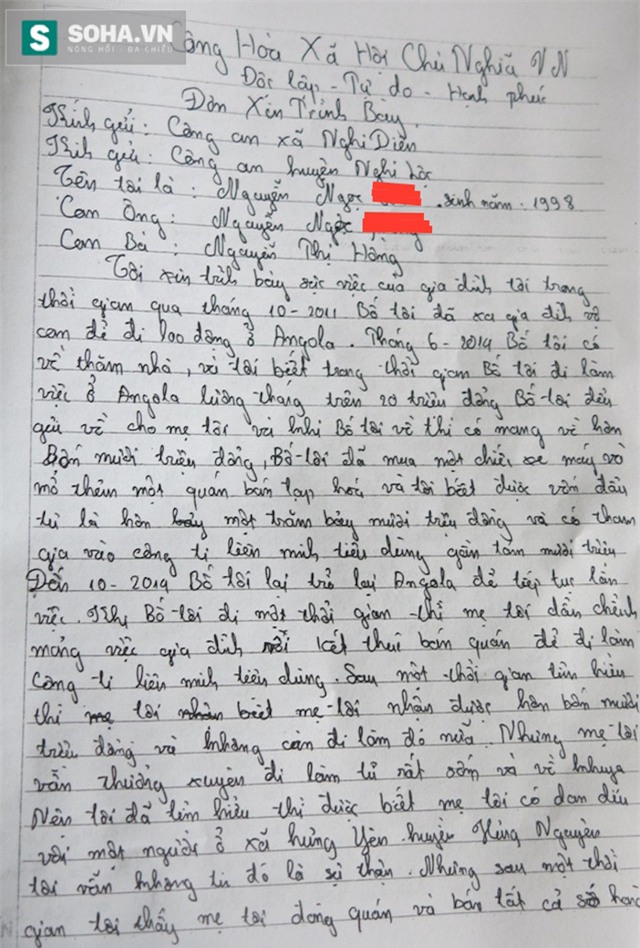 Trong lá đơn trình bày sự việc với cơ quan chức năng, S. kể lại rành rọt sự việc từ trước tới nay và sự việc vào sáng 3/3 mà mẹ đã tố cáo cha đánh đập, bạo hành.