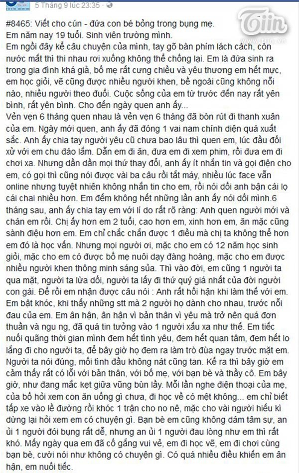 Được chia sẻ trên trang NEU Confessions, câu chuyện mang tiêu đề 'Viết cho cún - đứa con bé bỏng trong bụng mẹ' là tâm sự của một cô nữ sinh vì yêu lầm người mà trót mang bầu.