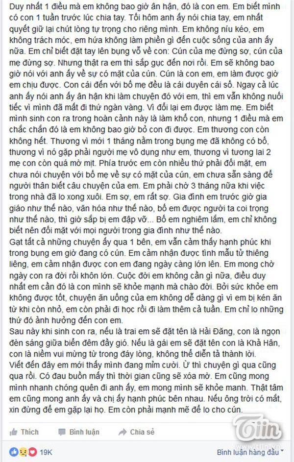 Những dòng tâm sự của một người sắp bước vào cuộc sống làm mẹ đơn thân này hiện đang nhận được sự quan tâm đặc biệt của cư dân mạng khi chỉ sau 1 ngày đăng tải, confession này đã đạt hơn 19.000 lượt thích, hơn 700 lượt chia sẻ và hơn 1.600 lượt bình luận.