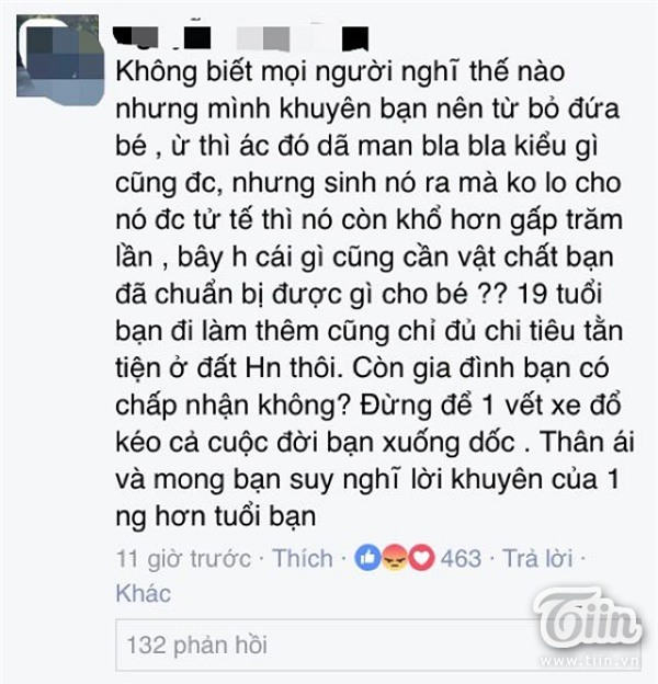 'Không biết mọi người nghĩ thế nào nhưng mình khuyên bạn nên từ bỏ đứa bé, ừ thì ác, nhưng sinh con ra mà không lo cho con được tử tế thì nó còn khổ hơn gấp trăm lần.