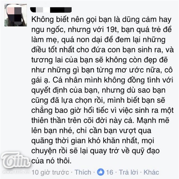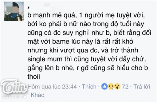 Biết rằng đối mặt với ba mẹ lúc này là rất rất khó nhưng khi vượt qua được và trở thành single mom thì cũng tuyệt vời đấy chứ, gắng lên bạn nhé, rồi gia đình cũng sẽ hiểu cho bạn thôi', nickname Anh Nguyen khích lệ.