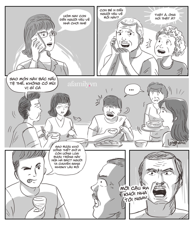 Đã thế, vừa nói chuyện với bố tôi vài câu, anh ta đã hỏi nhà nấu ăn chưa, anh ta đói bụng quá. Rồi anh ta ngồi vắt chân, đợi tôi và mẹ dọn cơm xong thì lao vào ăn hùng hổ. Vừa ăn vừa chê: "Món này sao bác lại bỏ rau mùi, phải bỏ hành mới đúng vị. Còn cá chép, bác phải ngâm sả, gừng trước cho cá khỏi tanh, tanh quá khó ăn bác ạ". Đấy, mẹ tôi nghe con rể tương lai chê khả năng nấu nướng của bà thôi là đã muốn tăng xông rồi.