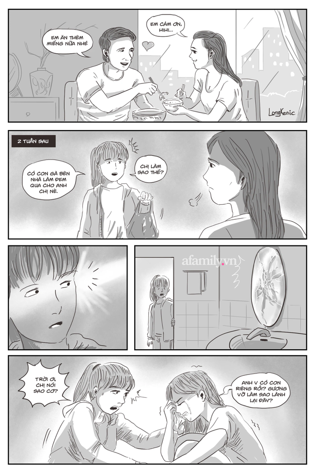 Cho đến khi thấy tấm gương vỡ nát trong nhà tắm, tôi đã hiểu vấn đề nghiêm trọng đến thế nào? Tôi hỏi mãi, chị gái mới ngước mặt lên trần nhà cho khỏi khóc, nhưng tiếng nói đã nghèn nghẹn: "Anh V có con riêng rồi".
