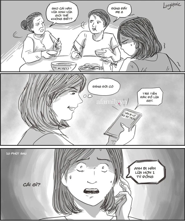 Trời đất như quay cuồng trước mặt tôi. Tôi đánh rơi điện thoại, ngất đi lúc nào không hay. Khi tỉnh lại thì đã nằm trong viện rồi. Không chỉ chồng tôi mà mẹ chồng tôi cũng đưa cho Hân hơn 300 triệu. Giờ bà cũng tăng huyết áp, cũng nhập viện giống tôi.