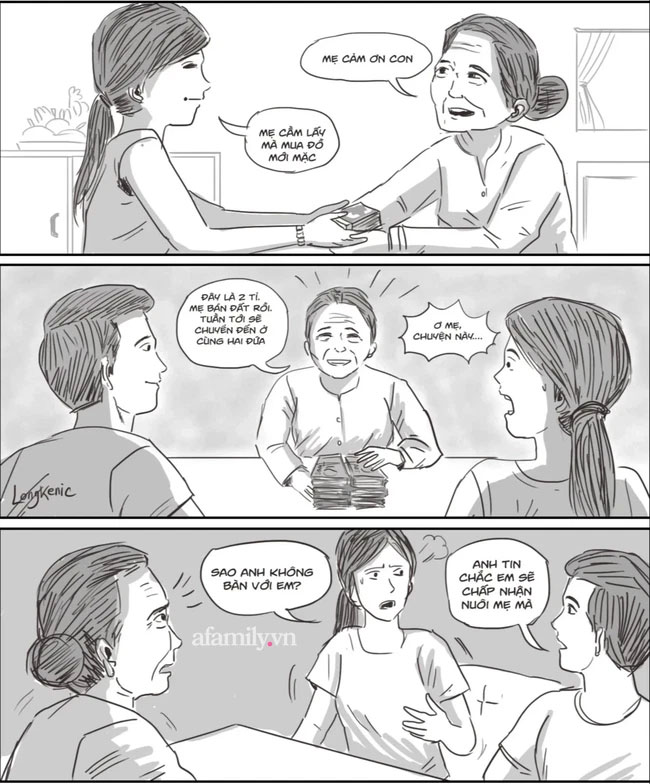 Tôi thương mẹ chồng là thật nhưng chưa bao giờ tôi nghĩ sẽ sống với bà cả đời. Người già đau bệnh nhiều, đôi khi còn hay lú lẫn, chăm sóc rất mệt. Chưa kể mâu thuẫn mẹ chồng nàng dâu nữa. Tôi muốn từ chối nhưng giờ bị đặt vào tình thế này thì khó mà mở lời. Chồng tôi lại nhận tiền rồi nên càng khó hơn. Hay tôi bàn với chồng mua căn nhà khác, thuê người giúp việc ở cùng để chăm sóc mẹ chồng nhỉ?