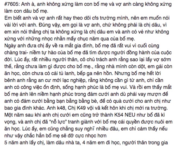Ngay từ những dòng mở đầu, người đọc đã có thể nhận thấy thái độ khá tức giận của cô gái: "Em biết anh và vợ anh rất hay theo dõi confession trường mình, nên em muốn nói vài lời với anh. Đúng vậy, em gọi là vợ anh, chứ không phải là chị dâu, vì em xin nói thẳng chị ta không xứng là chị dâu em và anh có vẻ như không xứng với những nhọc nhằn mấy chục năm qua của bố mẹ".