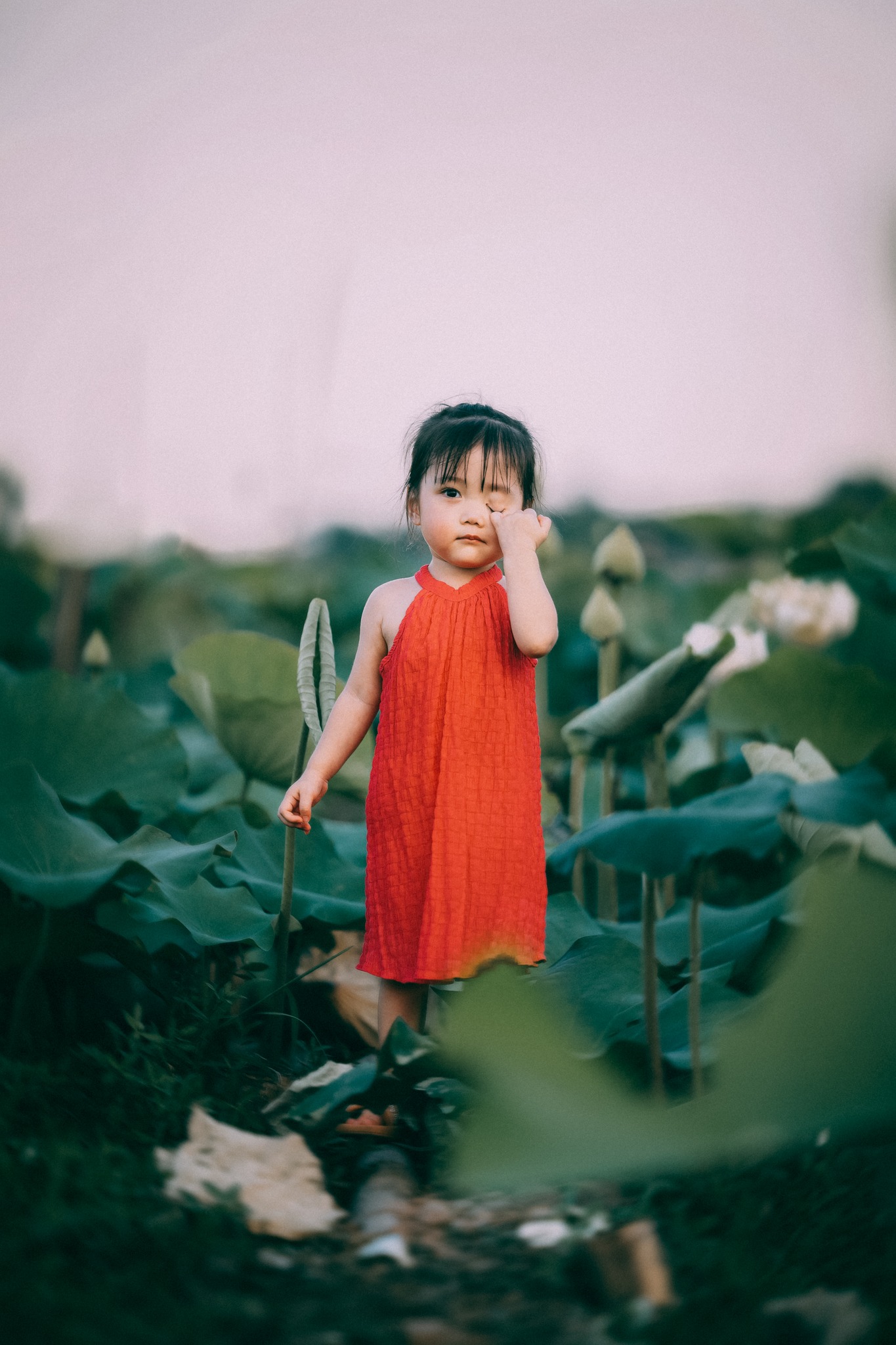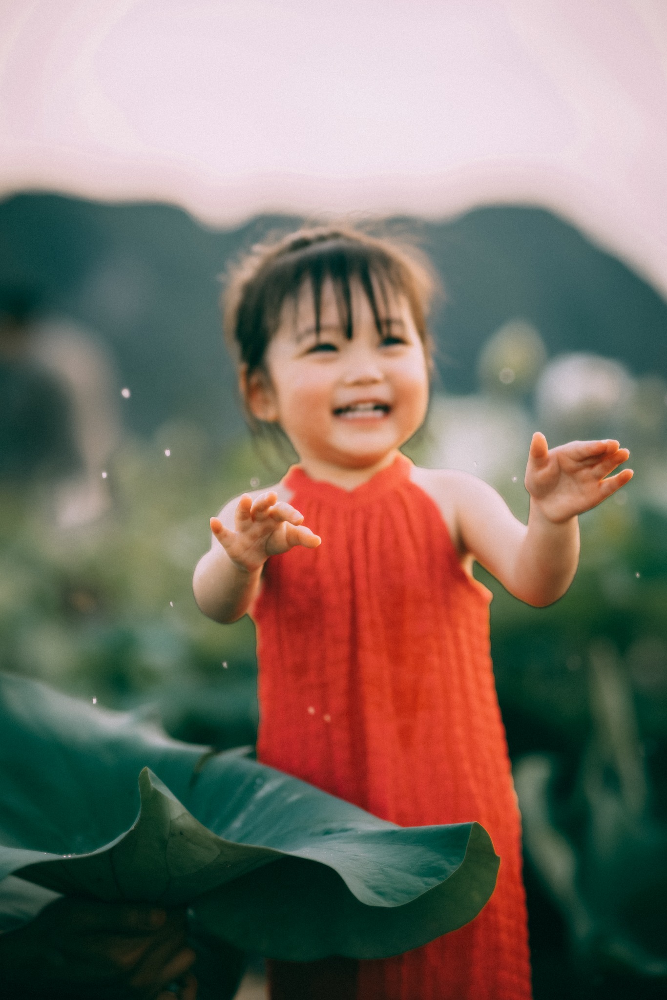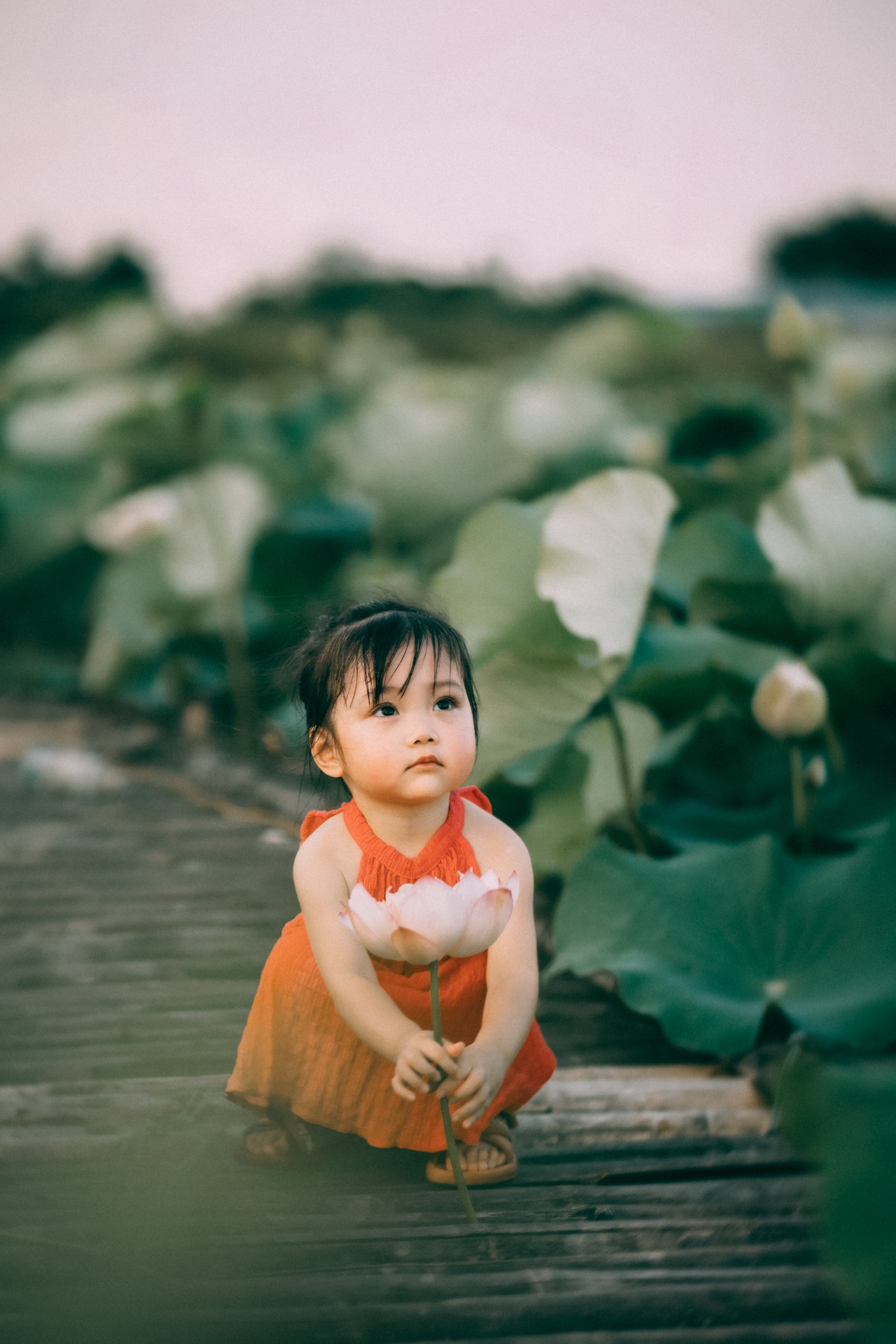 Giữa đầm sen, cô bé có đôi mắt to tròn, chiếc má hồng xinh xắn cùng biểu cảm cưng xỉu khiến người xem tan chảy. Khoảnh khắc bé Đậu Đậu cười tươi rói, nhắm mắt hay đùa nghịch với những bông sen cũng đủ tạo nên những thước ảnh đáng nhớ.