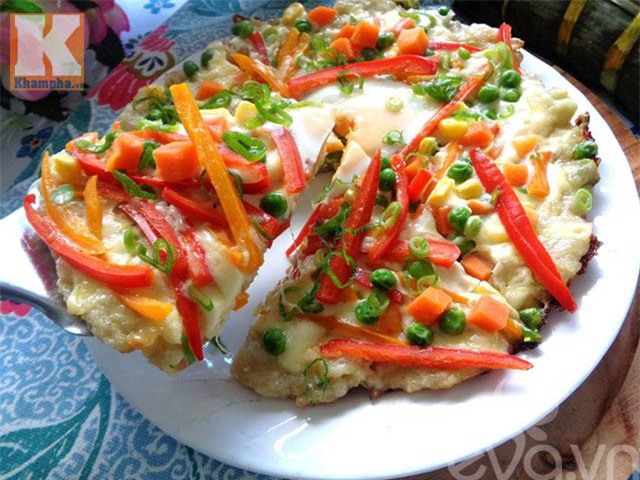 Pizza bánh chưng cho ra đĩa, rắc thêm chút hành lá là hoàn tất.