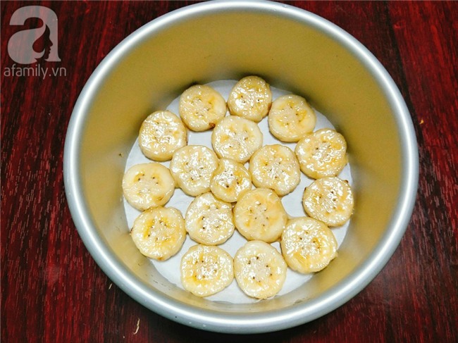 Trút tất cả âu chuối vào khuôn, dàn đều cho bằng phẳng rồi xếp 1 lượt chuối còn lại lên trên cùng. Cho bánh vào lò nướng khoảng 80-90 phút là bánh chuối đã chín.