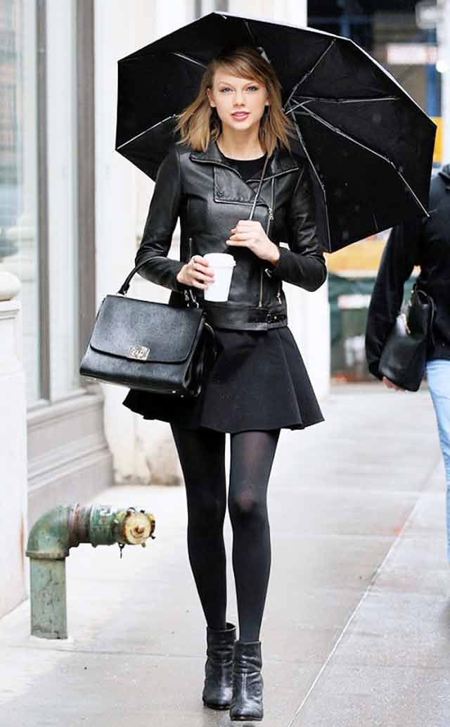 Công chúa nhạc đồng quê Taylor Swift ứng dụng thành công mốt ‘quần tất + chân váy’. Trông cô nàng thực sự trẻ trung và năng động với item sáng tạo này.