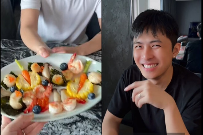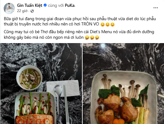 Cụ thể, Gin Tuấn Kiệt hài hước chia sẻ: “Bữa giờ tôi đang trong giai đoạn vừa phục hồi sau phẫu thuật vừa diet do lúc phẫu thuật bị truyền nước hơi nhiều nên có hơi tròn vo. Cũng may tôi có bé Thơ đầu bếp riêng nên cái Diet’s Menu nó vừa đủ dinh dưỡng không gây béo mà nó còn ngon má ơi luôn”.