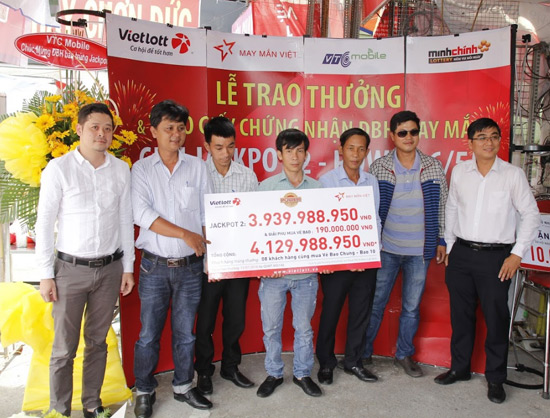 Hình ảnh các chủ nhân của tấm vé Bao 10 nhận giải trong lễ trao thưởng kết hợp trao giấy chứng nhận điểm bán hàng may mắn tại Đại lý May mắn Việt TP.HCM