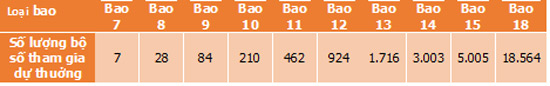 Ví dụ, nếu chọn Bao 18, từ 18 cặp số sẽ tạo ra được 18.654 dãy số, tương ứng 18.654 bộ số tham gia dự thưởng. Như vậy, càng chọn bao nhiều số, lượng bộ số dự thưởng càng nhiều, mang lại xác suất trúng giải Jackpot càng cao hơn so với việc chỉ mua 1 bộ số thông thường với giá 10.000 đồng.