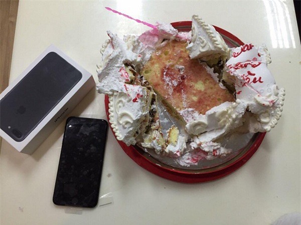 Những bức ảnh ghi lại chiếc bánh kem trên đó có chữ 'anniversary 4 years vợ yêu (kỷ niệm 4 năm vợ yêu)' và một chiếc điện thoại iPhone 7 màu đen.