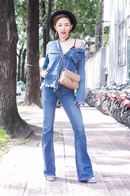 Hồ Ngọc Hà cũng là một trong những mỹ nhân ưa chuộng xu hướng thời trang Double denim, cô sang chảnh khi phối cùng áo thun hai dây và giày cao gót sành điệu.