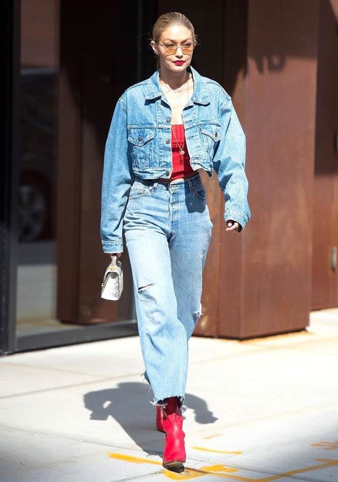 Gigi Hadid là một trong những siêu mẫu đầu tiên lăng xê xu hướng Double denim, cô rất cao tay khi chọn tông đỏ hài hòa giữa áo và boots để set đồ trở nên quá hoàn hảo.
