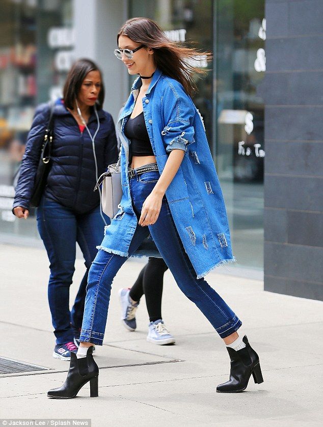 Bella Hadid cũng không hề kém cạnh khi chọn áo khoác jeans dáng dài cùng crop top. Sự chênh lệch về độ dài ngắn khiến tổng thể thêm phần thú vị và ngộ nghĩnh hơn.