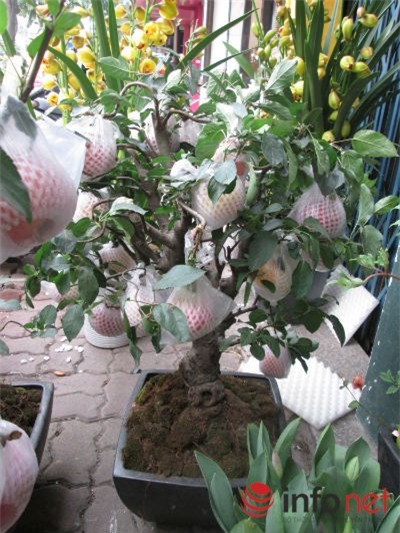 Theo quan sát, mỗi cây táo cảnh cao hơn 1m, có khoảng chục quả táo. Quả to, tròn trịa, màu sắc bắt mắt. Tuy nhiên, chủ cửa hàng cũng lưu ý, không nên hái quả để ăn vì không biết quả có được sử dụng thuốc kích thích, bảo quản hay không.