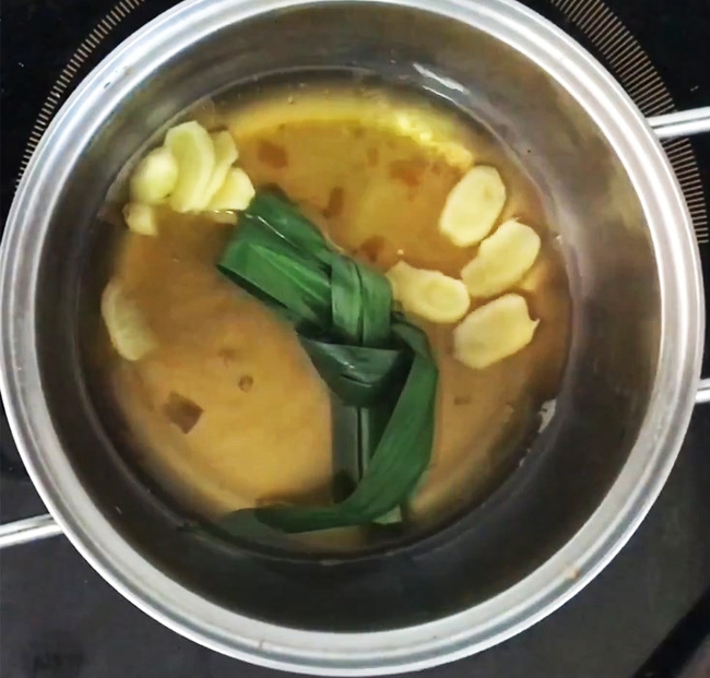 Bạn nạo vỏ gừng, rửa sạch và thái lát mỏng. Sau đó, cho vào nồi 150ml nước, 4 viên đường thốt nốt. Vừa đun vừa khuấy hỗn hợp trên lửa nhỏ cho đường tan hết rồi thêm lá dứa vào, tiếp tục nấu 5 phút nữa thì tắt bếp.