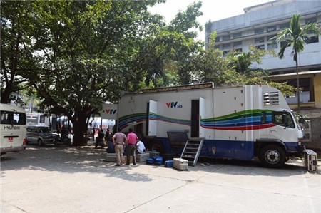 | Xe mầu của Đài truyền hình hoàn tất các khâu chuẩn bị cho chương trình truyền hình trực tiếp lúc 7h ngày 12/10. |