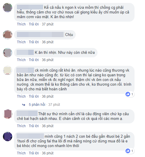 Trong số hàng trăm bình luận của các mẹ, không thấy ai bênh vực người chồng thiếu tâm lý của T. Tội nghiệp bà mẹ 2 con, vất vả chăm 2 con nhỏ, phục vụ chồng hết lòng hết sức còn bị gạt mâm cơm vất vả nấu ra.