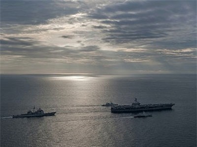 Tàu Mỹ và Malaysia lưu thông ở Eo Malacca. Ảnh: Hải quân Mỹ