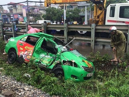 Một chiếc xe taxi hãng Mai Linh sáng nay chạy cắt ngang qua đường sắt bị tàu hỏa kéo lê một đoạn dài trên đường Ngọc Hồi, huyện Thanh Trì, Hà Nội.