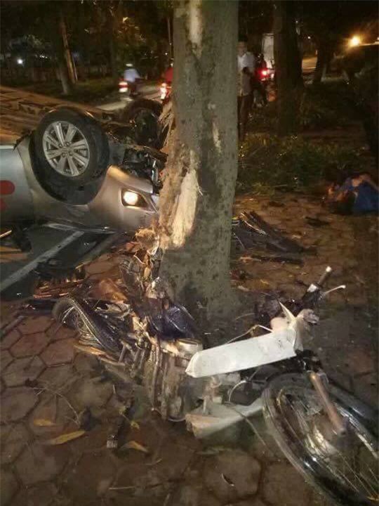 Tại hiện trường, xe taxi đâm vào gốc cây ven đường, lật ngửa. Phần đầu xe taxi hư hỏng nặng. Bên cạnh là chiếc xe máy biến dạng hoàn toàn. Ngay sau đó, lực lượng chức năng đã có mặt tại hiện trường điều tra nguyên nhân vụ tai nạn.
