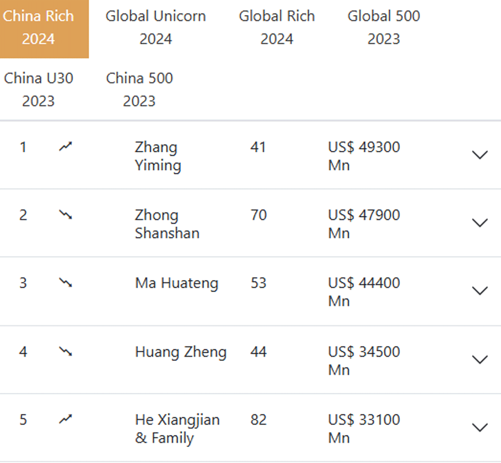 Theo danh sách tỷ phú được Viện nghiên cứu Hồ Nhuận (Hurun) công bố hôm 29/10, nhà sáng lập công ty mẹ của TikTok là Zhang Yiming lần đầu tiên trở thành người giàu nhất Trung Quốc với khối tài sản đạt 49,3 tỷ USD, vượt qua ông trùm nước đóng chai Chung Sơn Sơn (Zhong Shanshan). Nhà sáng lập Tencent Mã Hóa Đằng (Pony Ma) đứng thứ 3.