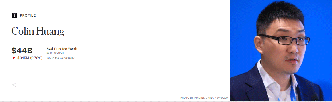 Vào đầu năm 2021, tài sản ròng của Huang đã từng đạt mức 71,5 tỷ USD nhưng cũng sụt giảm nhanh chóng sau đó khi cổ phiếu PDD mất gần 90%. Tuy nhiên, PDD Holdings của Colin Huang đã bứt phá trở lại với chiến lược tấn công thị trường nước ngoài dưới thương hiệu Temu, nhờ sự hậu thuẫn của gã khổng lồ công nghệ Tencent Holdings.