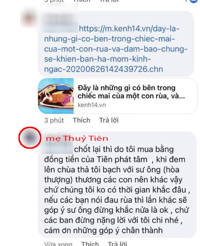 Sau khi vấp phải nhiều ý kiến trái chiều, mẹ Thuỷ Tiên đã để lại bình luận nhằm minh oan cho bản thân, khẳng định việc khắc tên trên mai rùa là vì mục đích tốt, để không ai bắt và ăn thịt rùa. Ít lâu sau, mẹ của nữ ca sĩ tiếp tục khẳng định chuyện khắc tên là do người khác làm, không phải bản thân bà, đồng thời khuyên khán giả chỉ nên góp ý một cách chân thành chứ đừng chỉ trích nặng nề vì người thực hiện hành động khắc tên lên mai rùa là một nhân vật khác.