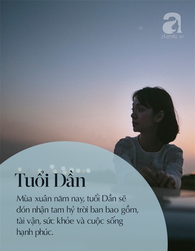 Không cần phải vào dịp Tết nguyên đán mà trong thời điểm bình thường tuổi Dần cũng được trời ban tặng nhiều phước lành và may mắn. Trời sinh họ là những người có tính mạo hiểm, không ngại đối mặt với khó khăn, thử thách, sẵn sàng làm mọi thứ để nắm bắt cơ hội tốt trong đời, vì vậy, việc gặt hái được thành công với họ không phải là điều khó khăn. Mùa xuân năm nay, tuổi Dần sẽ đón nhận tam hỷ trời ban. Thứ nhất là hạnh phúc và vui vẻ, thứ hai là sức khỏe dồi dào, thứ ba là tiền bạc dư dả đủ để mỗi ngày đều sung túc, trọn vẹn. Tuy nhiên, tuổi Dần phải nên nhớ những thứ này không phải lúc nào ở bên cạnh bạn, mà thay vào đó là phải nỗ lực không ngừng để giữ gìn. Chỉ có như thế thì vận mệnh của tuổi Dần mới viên mãn cả năm.