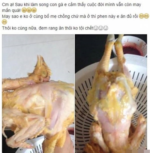 Ngoài món xôi gấc, thịt gà cũng là món ngon thường xuyên xuất hiện trong nhiều bữa cơm của các gia đình. Đặc biệt dịp Tết, món gà luộc nguyên con để dâng lên bàn thờ tổ tiên càng không thể thiếu. Có điều, chú gà đáng thương này khi rơi vào tay nàng dâu "đảm đang" thực hiện trước mặt mẹ chồng tương lại thật khiến mọi người "rùng rợn".