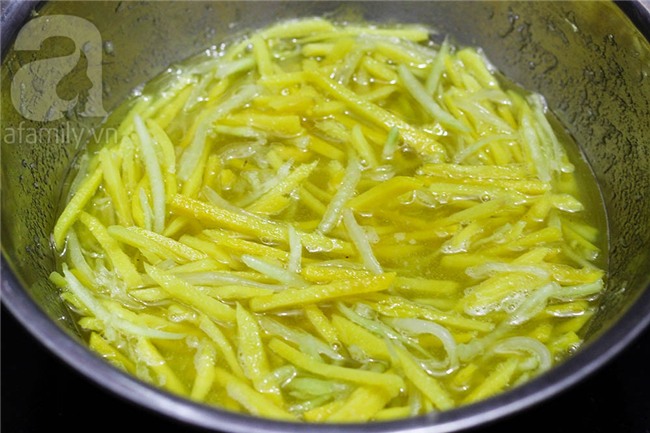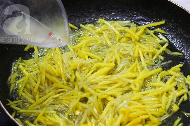 Đảo mứt đến khi sợi mứt trong, dẻo và sờ hơi dính tay là được nhé! Bạn lấy ra để mứt thật nguội thì cho vào hũ khô đậy kín để bảo quản nha.