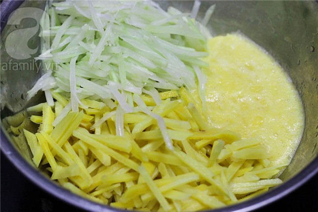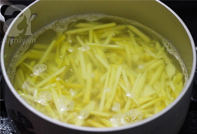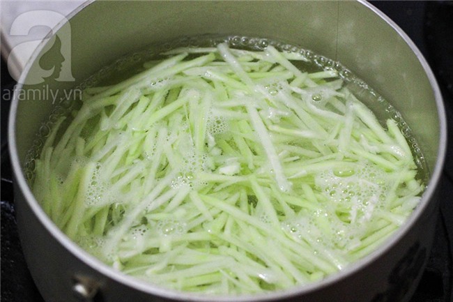 Đổ nước và chút muối vào nồi đun sôi, cho đu đủ nạo sợi vào trần qua trong khoảng 2 phút.