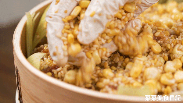 Bước 5: Lót vỏ bắp ngô vào xửng hấp, xếp sườn đã trộn vào.